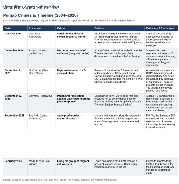 ਪੰਜਾਬ, ਜੋ ਇਤਿਹਾਸਕ ਤੌਰ ‘ਤੇ ਭਾਰਤ ਦੇ ਸਭ ਤੋਂ ਸੰਪੰਨ ਅਤੇ ਮਹਿਮਾਨਨਿਵਾਜ਼ ਸੂਬਿਆਂ ਵਿੱਚੋਂ ਇੱਕ ਰਿਹਾ ਹੈ, ਕਾਫ਼ੀ ਸਮੇਂ ਤੋਂ ਉੱਤਰ ਪ੍ਰਦੇਸ਼ ਅਤੇ ਬਿਹਾਰ ਤੋਂ ਪ੍ਰਵਾਸੀ ਮਜ਼ਦੂਰਾਂ ‘ਤੇ ਆਪਣੀ ਖੇਤੀਬਾੜੀ, ਉਦਯੋਗ ਅਤੇ ਉਸਾਰੀ ਖੇਤਰ ਲਈ ਨਿਰਭਰ ਕਰਦਾ ਆਇਆ ਹੈ। ਅੰਦਾਜ਼ੇ ਮੁਤਾਬਕ ਕਿਸੇ ਵੀ ਸਮੇਂ ਪੰਜਾਬ ਵਿੱਚ 18 ਲੱਖ ਤੋਂ ਵੱਧ ਪ੍ਰਵਾਸੀ ਮਜ਼ਦੂਰ ਕੰਮ ਕਰਦੇ ਹਨ, ਜੋ ਸੂਬੇ ਦੀ ਆਰਥਿਕ ਰੀੜ੍ਹ ਦੀ ਹੱਡੀ ਬਣ ਚੁੱਕੇ ਹਨ। ਪਰ ਪਿਛਲੇ ਕੁਝ ਸਾਲਾਂ ਵਿੱਚ  ਅਤੇ ਖਾਸ ਕਰਕੇ 2024-25 ਤੋਂ ਬਾਅਦ ਕਥਿਤ ਤੌਰ ‘ਤੇ ਗ਼ੈਰ-ਦਸਤਾਵੇਜ਼ੀ ਜਾਂ ਅਣਜਾਣ ਪ੍ਰਵਾਸੀਆਂ ਵੱਲੋਂ ਕੀਤੇ ਗਏ ਹਿੰਸਕ ਅਤੇ ਭਿਆਨਕ ਅਪਰਾਧਾਂ ਦੀ ਲੜੀ ਨੇ ਕਈ ਭਾਈਚਾਰਿਆਂ ਦੇ ਸਮਾਜਕ ਤਾਣੇ-ਬਾਣੇ ਨੂੰ ਤਾਰ-ਤਾਰ ਕਰ ਦਿੱਤਾ ਹੈ। ਇਸ ਨਾਲ ਰੋਸ ਮੁਜ਼ਾਹਰੇ, ਪੰਚਾਇਤੀ ਮਤੇ, ਸਵੈ-ਰੱਖਿਆ ਦੀਆਂ ਧਮਕੀਆਂ ਅਤੇ ਸ਼ਨਾਖਤ ਦੀ ਪੁਸ਼ਟੀ, ਜਨਤਕ ਸੁਰੱਖਿਆ ਅਤੇ ਸਰਕਾਰੀ ਜ਼ਿੰਮੇਵਾਰੀ ਬਾਰੇ ਭਖਵੀਂ ਬਹਿਸ ਛਿੜ ਪਈ ਹੈ। ਅਪਰਾਧ ਇੱਕਲੇ-ਇੱਕਲੇ ਨਹੀਂ ਹਨ। ਇਹ ਇੱਕ ਪੈਟਰਨ ਬਣਾਉਂਦੇ ਹਨ: ਬਿਨਾਂ ਵੈਧ ਪਛਾਣ-ਪੱਤਰਾਂ ਦੇ ਲੋਕ ਦੂਜੇ ਸੂਬਿਆਂ ਤੋਂ ਆਉਂਦੇ ਹਨ, ਗੰਭੀਰ ਅਪਰਾਧ ਕਰਦੇ ਹਨ  ਜਿਸ ਵਿੱਚ ਜਿਣਸੀ ਹਮਲਾ, ਕਤਲ ਅਤੇ ਜਬਰੀ ਵਸੂਲੀ ਸ਼ਾਮਲ ਹੈ  ਅਤੇ ਪੁਲਿਸ ਦੇ ਉਹਨਾਂ ਤੱਕ ਪਹੁੰਚਣ ਤੋਂ ਪਹਿਲਾਂ ਫ਼ਰਾਰ ਹੋ ਜਾਂਦੇ ਹਨ। ਸਥਾਨਕ ਔਰਤਾਂ ਦੱਸਦੀਆਂ ਹਨ ਕਿ ਉਹ ਆਪਣੇ ਹੀ ਮੁਹੱਲਿਆਂ ਵਿੱਚ ਤੇਜ਼ੀ ਨਾਲ ਅਸੁਰੱਖਿਅਤ ਮਹਿਸੂਸ ਕਰ ਰਹੀਆਂ ਹਨ ਕਿਉਂਕਿ ਮਰਦਾਂ ਦੇ ਟੋਲੇ ਗਲੀਆਂ ਦੇ ਕੋਨਿਆਂ ‘ਤੇ ਖੁੱਲ੍ਹੇਆਮ ਸ਼ਰਾਬ ਪੀਂਦੇ ਹਨ। ਪਰਿਵਾਰ ਡਰ ਵਿੱਚ ਜੀ ਰਹੇ ਹਨ। ਅਤੇ ਸਿਆਸੀ ਜਵਾਬ ਹੌਲਾ, ਅਸੰਗਤ ਅਤੇ ਬਹੁਤੇ ਮਾਮਲਿਆਂ ਵਿੱਚ ਵੋਟ ਬੈਂਕ ਦੀ ਗਿਣਤੀ-ਮਿਣਤੀ ‘ਤੇ ਆਧਾਰਿਤ ਰਿਹਾ ਹੈ।