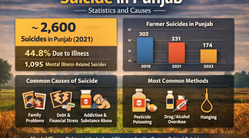 Read Moreਪੰਜਾਬ ਵਿੱਚ ਖੁਦਕੁਸ਼ੀ ਇੱਕ ਮਹੱਤਵਪੂਰਨ ਜਨਤਕ ਸਿਹਤ ਅਤੇ ਸਮਾਜਿਕ ਚਿੰਤਾ ਬਣੀ ਹੋਈ ਹੈ, ਜੋ ਮਾਨਸਿਕ ਸਿਹਤ ਮੁੱਦਿਆਂ, ਪੁਰਾਣੀ ਬਿਮਾਰੀ, ਆਰਥਿਕ