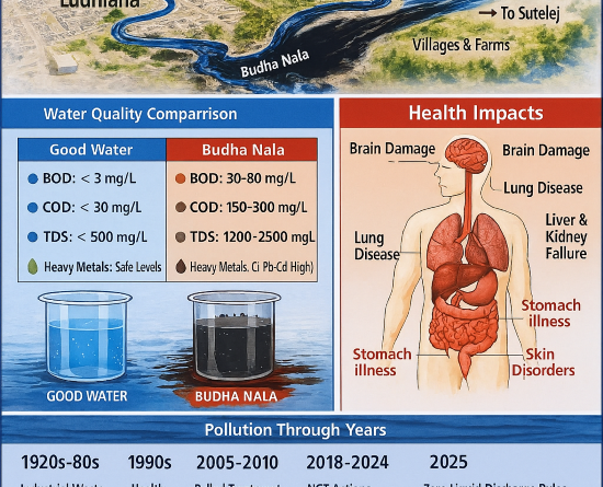 Read Moreਬੁੱਢਾ ਨਾਲਾ, ਜੋ ਕਦੇ ਲੁਧਿਆਣਾ ਵਿੱਚੋਂ ਵਗਦਾ ਇੱਕ ਕੁਦਰਤੀ ਤਾਜ਼ੇ ਪਾਣੀ ਦਾ ਦਰਿਆ ਸੀ, ਦਹਾਕਿਆਂ ਤੋਂ ਇੱਕ ਭਾਰੀ ਪ੍ਰਦੂਸ਼ਿਤ ਨਾਲੇ